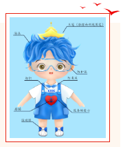 設計說明:圍繞“愛在深藍”志愿服務為主題設計了一名小男孩IP形象,深藍色的發色呼應主題。紅色的帽子和三角巾突出志愿服務的形象與船舶青年熱血有愛志愿精神。雪白的T恤在胸口印有“愛在深藍”品牌LOGO,彰顯小男孩的身份與純潔進步的“艦船報國、向海圖強”的船舶青年志向。可愛且色塊明顯的IP形象設計,通過紅藍撞色使IP形象更具有吸引力。小男孩形象設計簡潔,方便進行后期表情包、日歷、書簽等2D周邊設計,與3D實物生產。