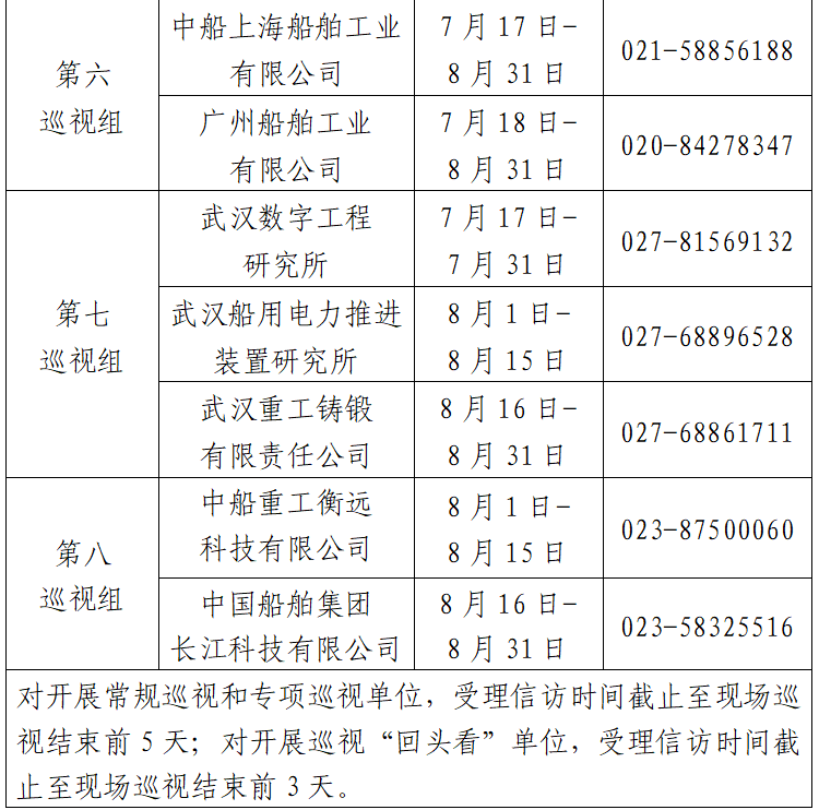 根據中國船舶集團黨組2023年第一輪巡視工作部署,截至2023年7月17日,巡視工作已經鋪開。其中,對中國船舶工業貿易有限公司、中國船舶集團物資有限公司、江蘇自動化研究所、河南柴油機重工有限責任公司、中國船舶集團有限公司綜合技術經濟研究院、船舶信息研究中心、中國船舶集團國際工程有限公司等7家單位開展常規巡視,對中船上海船舶工業有限公司、廣州船舶工業有限公司等2家單位開展專項巡視,對武漢數字工程研究所、武漢船用電力推進裝置研究所、武漢重工鑄鍛有限責任公司、中國船舶集團長江科技有限公司、中船重工衡遠科技有限公司等5家單位開展巡視“回頭看”。