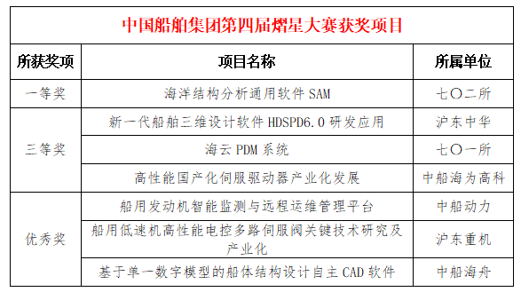 2025年1月3日,國務(wù)院國資委正式公布第四屆中央企業(yè)熠星創(chuàng)新創(chuàng)意大賽獲獎(jiǎng)名單。中國船舶集團(tuán)參賽項(xiàng)目榮獲一等獎(jiǎng)1項(xiàng)、三等獎(jiǎng)3項(xiàng)、優(yōu)秀獎(jiǎng)3項(xiàng),優(yōu)秀導(dǎo)師4名,集團(tuán)公司榮獲“優(yōu)秀組織單位”榮譽(yù)稱號。