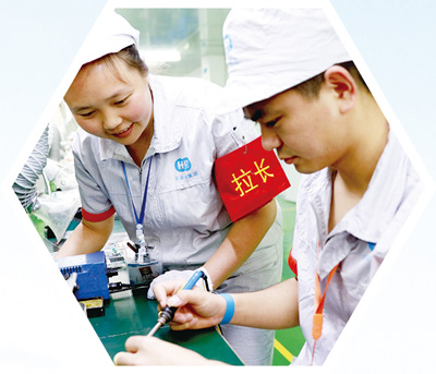 華鎣市一家企業(yè)的生產線負責人唐定燕(左),向徒弟講解生產技術。周松林攝
