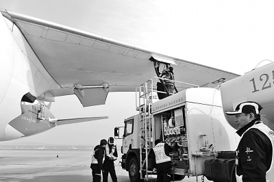11月21日,在北京首都國際機(jī)場,工作人員為海南航空HU497航班的波音787客機(jī)加注生物航煤。(新華社發(fā))