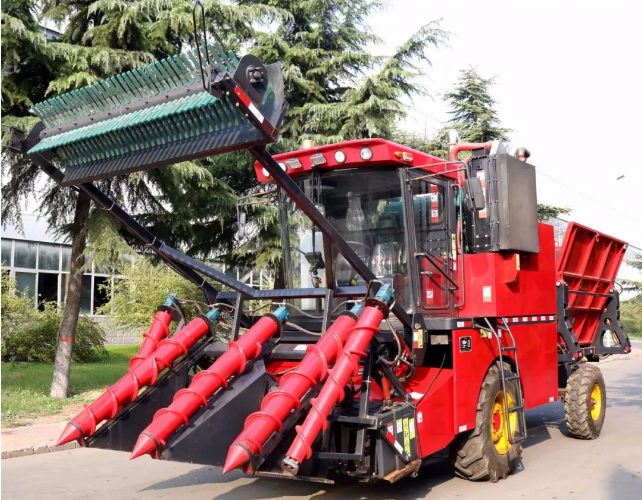 該大型農機設備,可收割田地坡度小于5°,種植壟距1. 1~1.2米的甘蔗,能同時完成甘蔗的扶正、分蔗、切梢、跟切、喂入、輸送、除雜和集料轉運等作業,不需要輔助工具,一次收割兩行,收割效率高。采用整桿式收割模式,有效解決了切斷式甘蔗存儲時間短的問題。獨特的切刀智能仿形系統,使甘蔗跟切喂入更順暢,減小蔗徑損失率,且宿根切口平整,保證甘蔗來年發芽率。