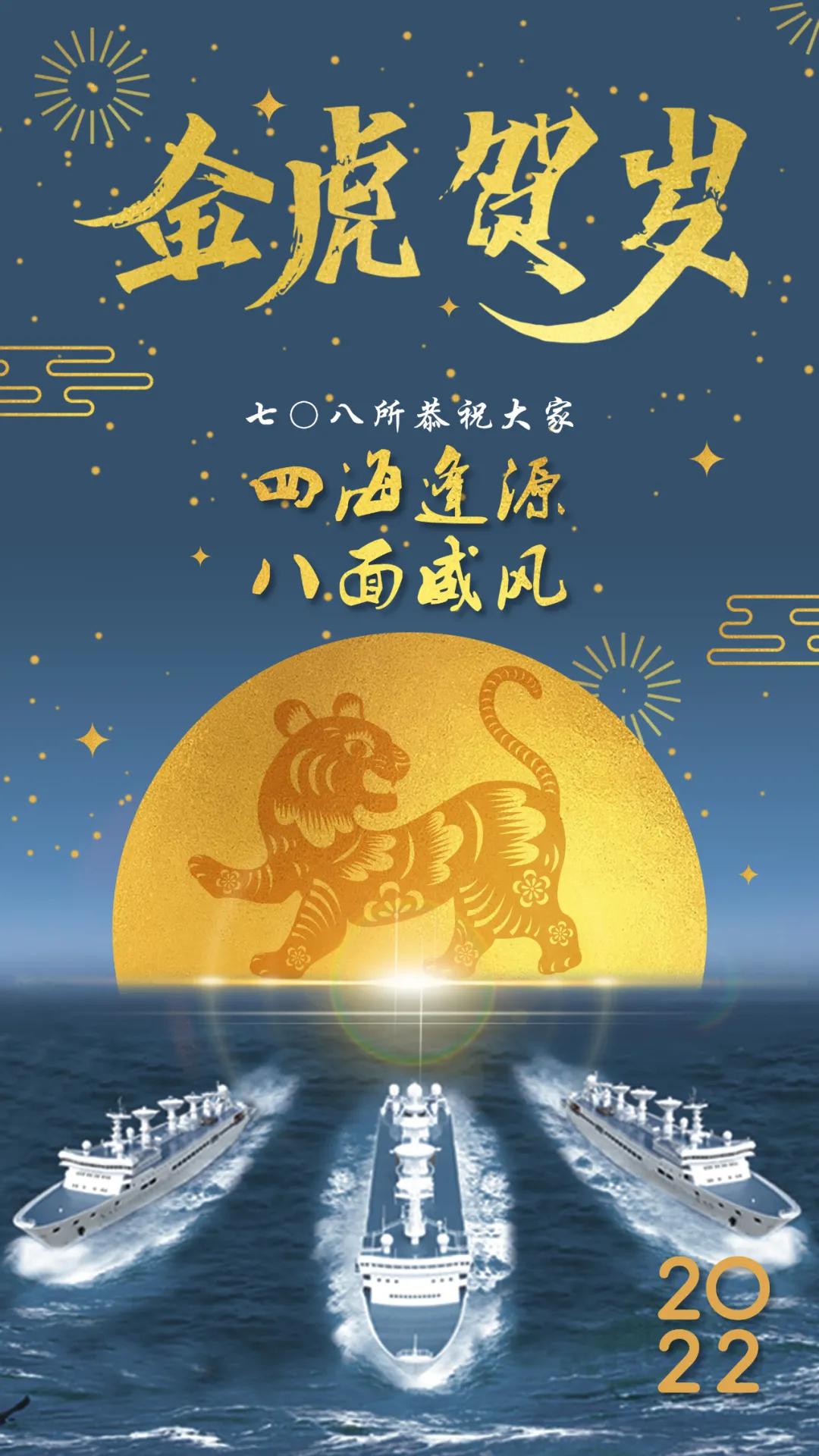 海報以七〇八所自主研發設計的遠望號船隊、金虎、星空、月亮為元素創作,彰顯祖國浩瀚海疆、無垠星空的安寧祥和。四十余年來,遠望號船隊劈波斬浪,守護著祖國的花好月圓。從遠望一號至遠望七號,凝結著幾代中國船舶人的智慧和汗水,堅守一方“浮動國土”。