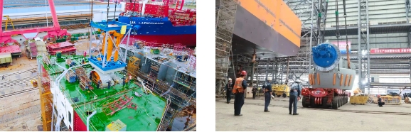 “夢想”號配備的7臺推進(jìn)器中,3臺全回轉(zhuǎn)伸縮推是黃埔文沖迄今總成過的最大伸縮推,并且建造過程中伸縮推需要進(jìn)行全程升降試驗(yàn),升降高度差達(dá)4.3米。完成試驗(yàn)的伸縮推總段重量超過了船廠龍門吊最高900噸的起重能力。“夢想”號工藝負(fù)責(zé)人馮仕清創(chuàng)新性地提出了采用龍門吊和履帶吊聯(lián)合吊裝的方法,最終保證了伸縮推的成功安裝。