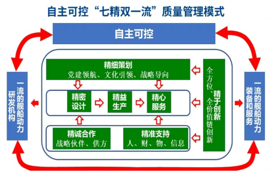 七一一所構建的“自主可控‘七精雙一流’質量模式”,以內外雙循環為驅動,通過“七精”過程,達到“雙一流”目標,確保提供具有一流戰斗力標準的裝備和服務結果,實現了質量管理的持續改進與創新發展。該模式不僅為行業提供了成熟的管理借鑒,更通過重大型號項目研制和批量供貨的實踐,帶動產業鏈配套供應商踐行正向設計理念,建成產學研深度融合的創新鏈,顯著提升了我國新型船舶動力的綜合研制能力。該模式是七一一所在多年實踐中,緊密結合行業特性和企業戰略,系統總結、提煉形成的一套具有鮮明特色的現代化質量管理方法體系。該模式的有效運行,全面驅動了七一一所在產品質量、服務品質、運營效益、品牌價值及可持續發展能力等方面的顯著提升。