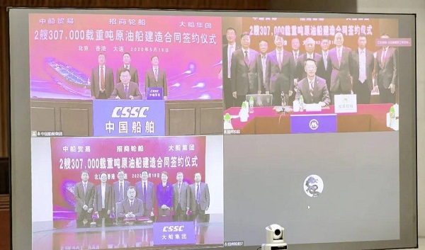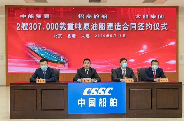 ????5月18日,中國船舶集團旗下大船集團、中船貿(mào)易與招商局集團旗下招商輪船在北京、大連、香港三地以“云簽約”方式簽署2艘30.7萬載重噸原油船建造合同。中國船舶集團副總經(jīng)理孫偉、招商局集團副總經(jīng)理王宏、招商輪船董事長謝春林出席簽約儀式,中船貿(mào)易董事長李洪濤、大船集團總經(jīng)理楊志忠、招商輪船總經(jīng)理王永新代表各方在建造合同上簽字。