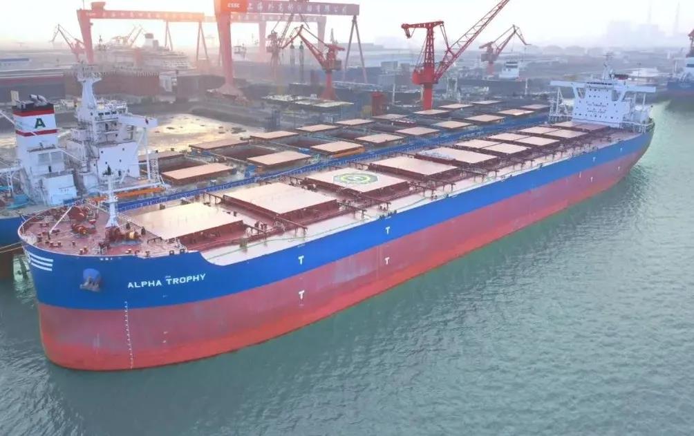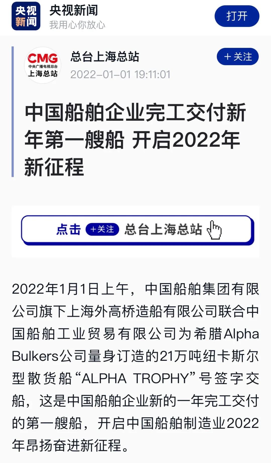 1月1日上午,中國船舶集團旗下外高橋造船聯(lián)合中船貿(mào)易建造的21萬噸紐卡斯?fàn)栃蜕⒇洿癆LPHA TROPHY”號簽字交船,這是中國船舶企業(yè)新的一年完工交付的第一艘船,開啟中國船舶制造業(yè)2022年昂揚奮進新征程。